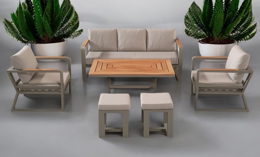 Viva Oturma Grubu, bahçelerinize yazın estetik havasını taşırken, dış mekanlarda evinizin konforunu yaşamanızı sağlar. Alüminyum iskeleti, hafif ve sağlam bir yapı sunarken, iroko ahşap detayları, doğal ve zarif bir atmosfer oluşturur. Outdoor kumaşı, suya ve hava koşullarına dayanıklılığıyla uzun yıllar konforlu kullanım sağlar.